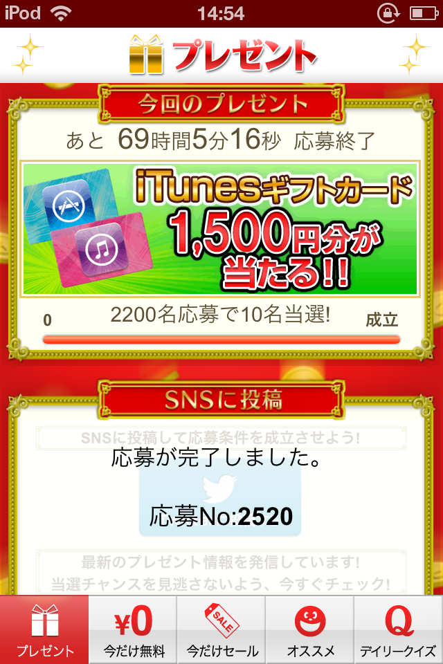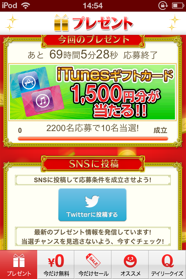 応募するためには、Twitterへのツイートや、アプリダウンロードなどの条件を満たす必要があります。